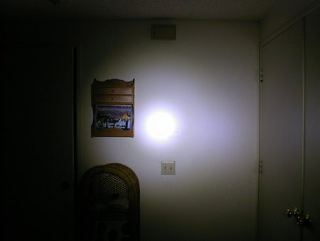 This is a comparison of a flashlight using a 1 watt Luxeon Star and the LXHL-NX05 type optics, to the Blaster II. The Blaster is on the left. Yes, the other beam is there, on the right, but doesn't show up much. ![]()