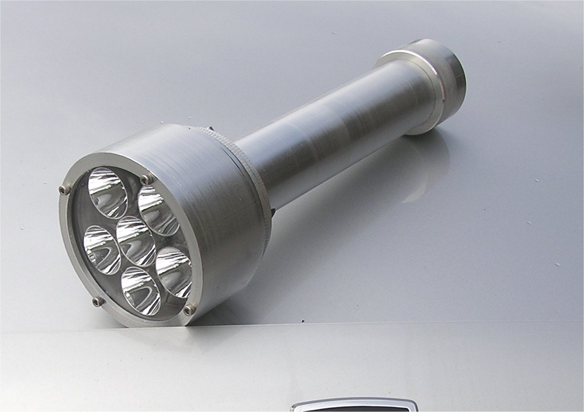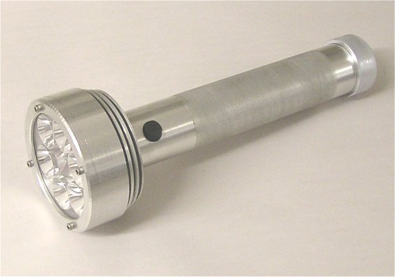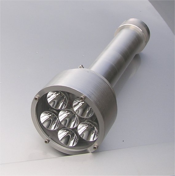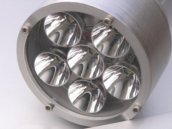 A new line of flashlights, which I call ELX. This light uses six 3W LEDs, wired in banks of 3 LEDs each in series. I use six 27mm reflectors in this version. It is powered by 10 AA NIMH rechargable batteries, and has an internal jack for charging (remove the tailcap to plug in the charger). (Batteries and charger are included with the premium version of this light.) The 6061 Aluminum body is substantial, with a 3" diameter head, large heat sink fins, and a 1.75" diameter body. An astounding, remarkable 432 lumens, and 14,800 lux reading. Absolutely amazing! Made in America by Elektro Lumens. We make these as we take the orders, in our own machine shop! Anodized clear only (silver).The ELX-6-27 differs from the ELX-6, in that is uses the larger 27mm reflectors (The ELX-6 uses 20mm reflectors.) This puts more of the light into the center hot spot, and less in the side spill. The head is 4" diameter, compared to 3" diamter of the ELX-6. Brightness of the ELX-6-27 is around 14,800 lux, compared to an average 10,000 to 12,000 lux for the ELX-6.This light is exceptional in it's performance, ahead of it's time in deployment, and there is nothing else like it on the market at this time. The future belongs to LED lighting. Archaic and fragile Halogen and H.I.D. lighting systems, look out! Outstanding features of this 22 watt LED flashlight: