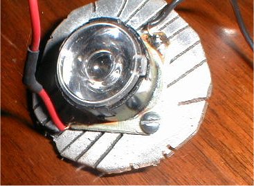 Here is the Luxoen Star with optics, mounted on a 1 7/8" disc. Notice the cuts in the disc. This gives the heat sink extra cooling ability. |